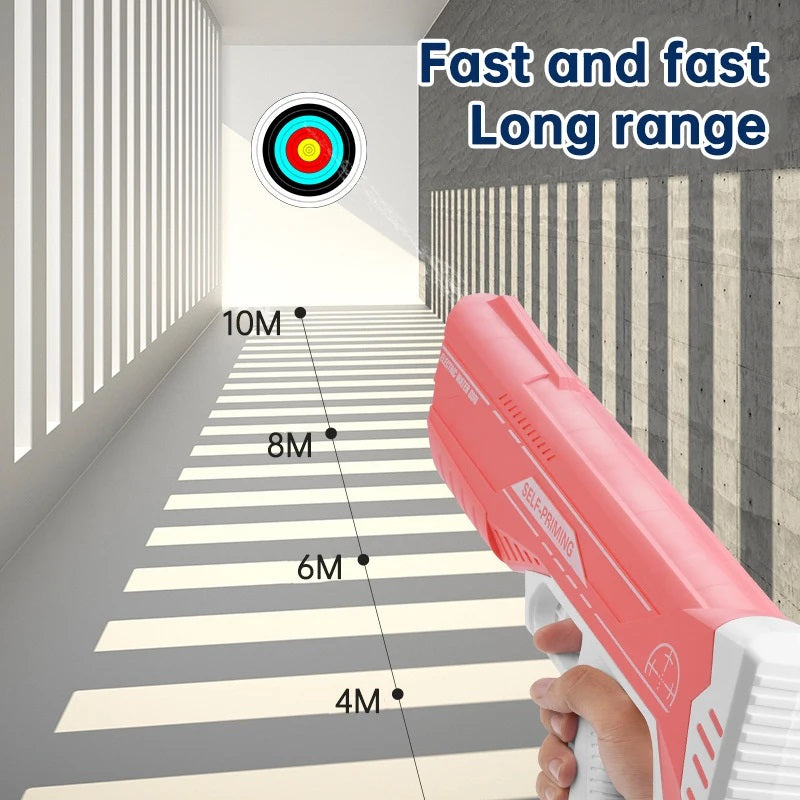 Outperform standard water guns with an impressive shooting range. The Cannon Electric Water Absorption Gun can shoot water up to 10 meters (over 30 feet), ensuring you can hit your targets from a distance.