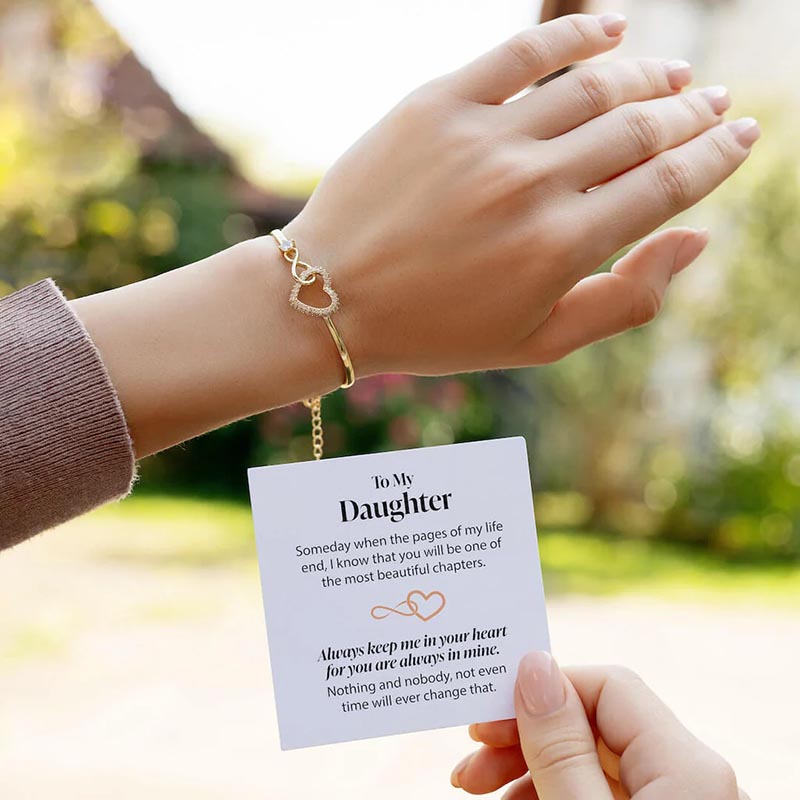 Crafted with an interlocking infinity and heart pendant, it embodies endless love and cherished moments. Each bracelet comes paired with a heartfelt message card: "To My Daughter, someday when the pages of my life end, I know you'll be one of the most beautiful chapters.