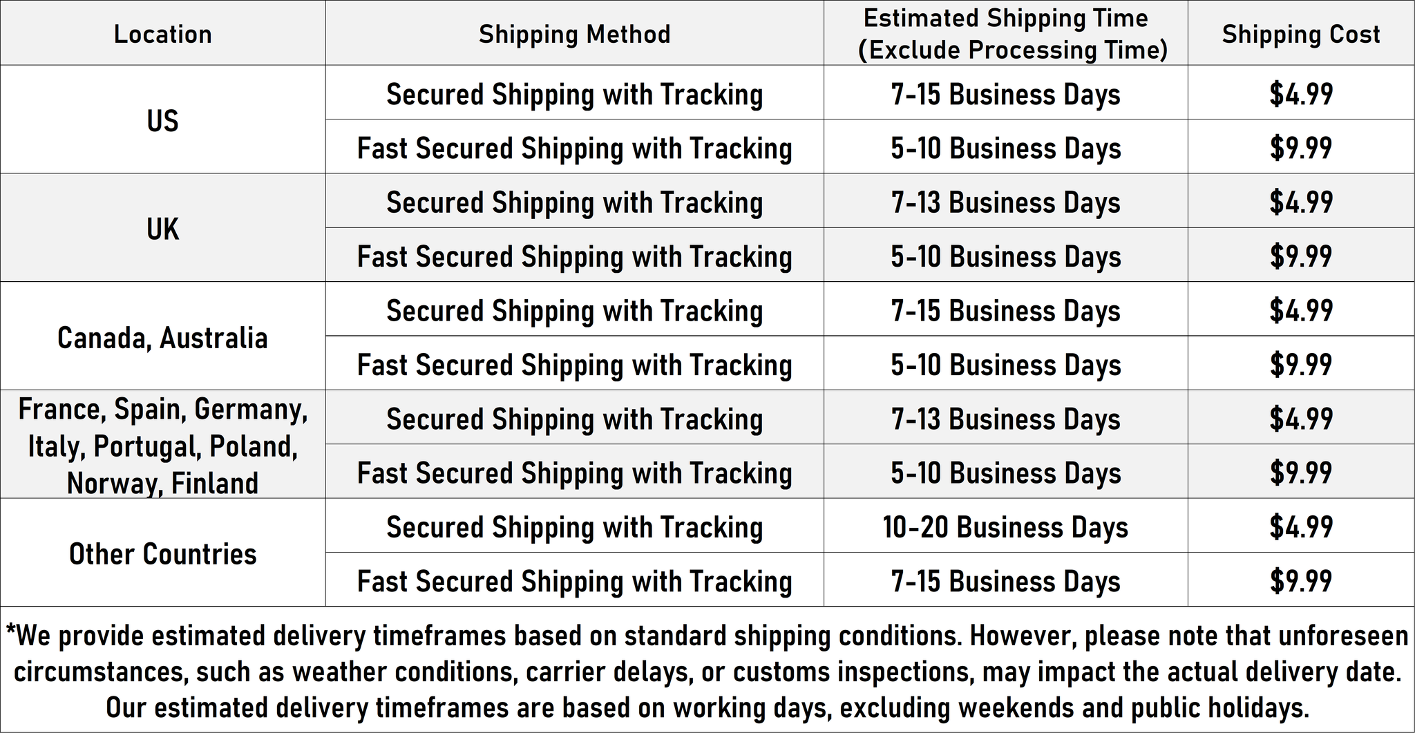 Please refer to the following table for shipping time: