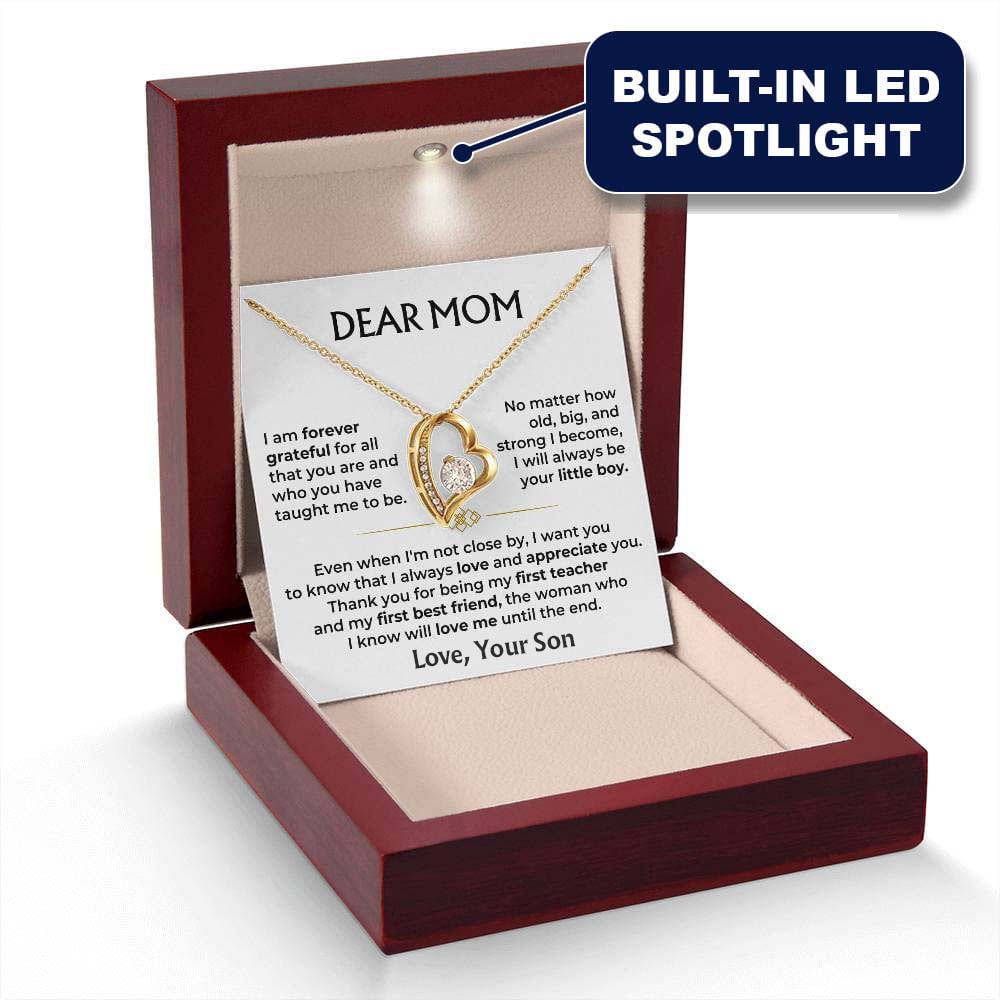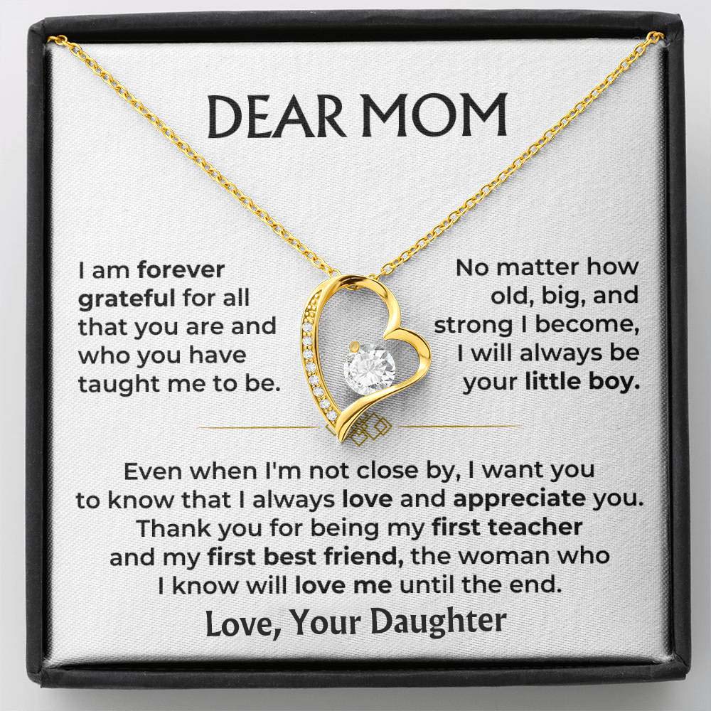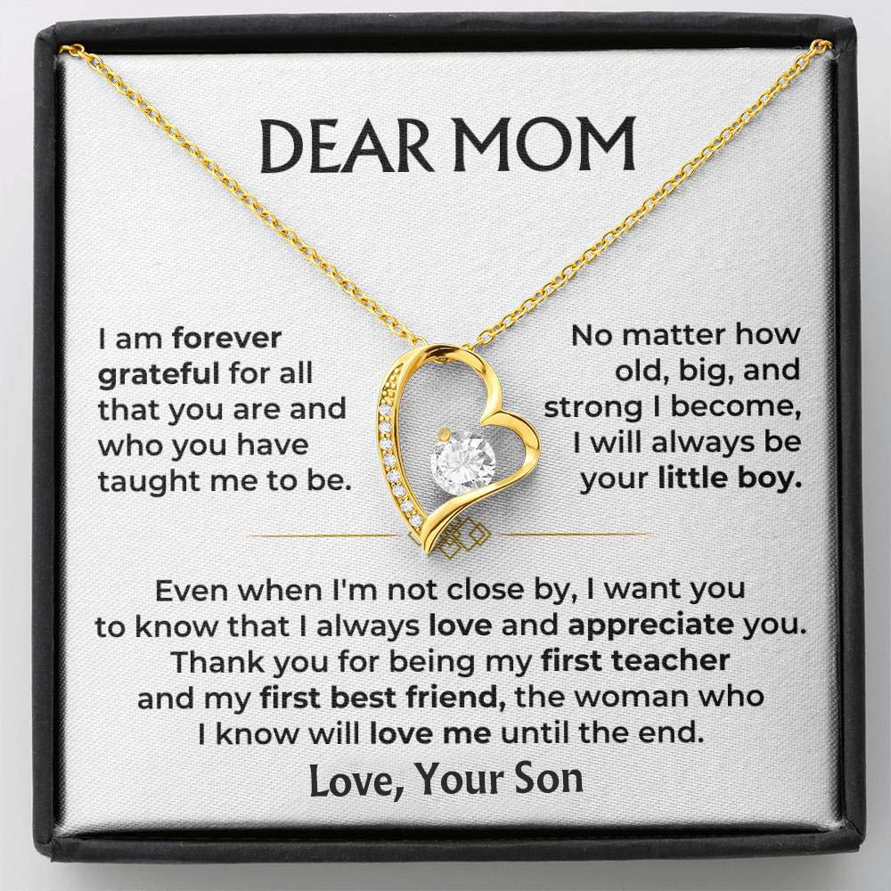 "DEAR MOM - I am forever grateful for all that you are and who you have taught me to be. No matter how old, big, and strong I become, I will always be your little boy. Even when I'm not close by, I want you to know that I always love and appreciate you! Thank you for being my first teacher and my first best friend, the woman who I know will love me until the end."