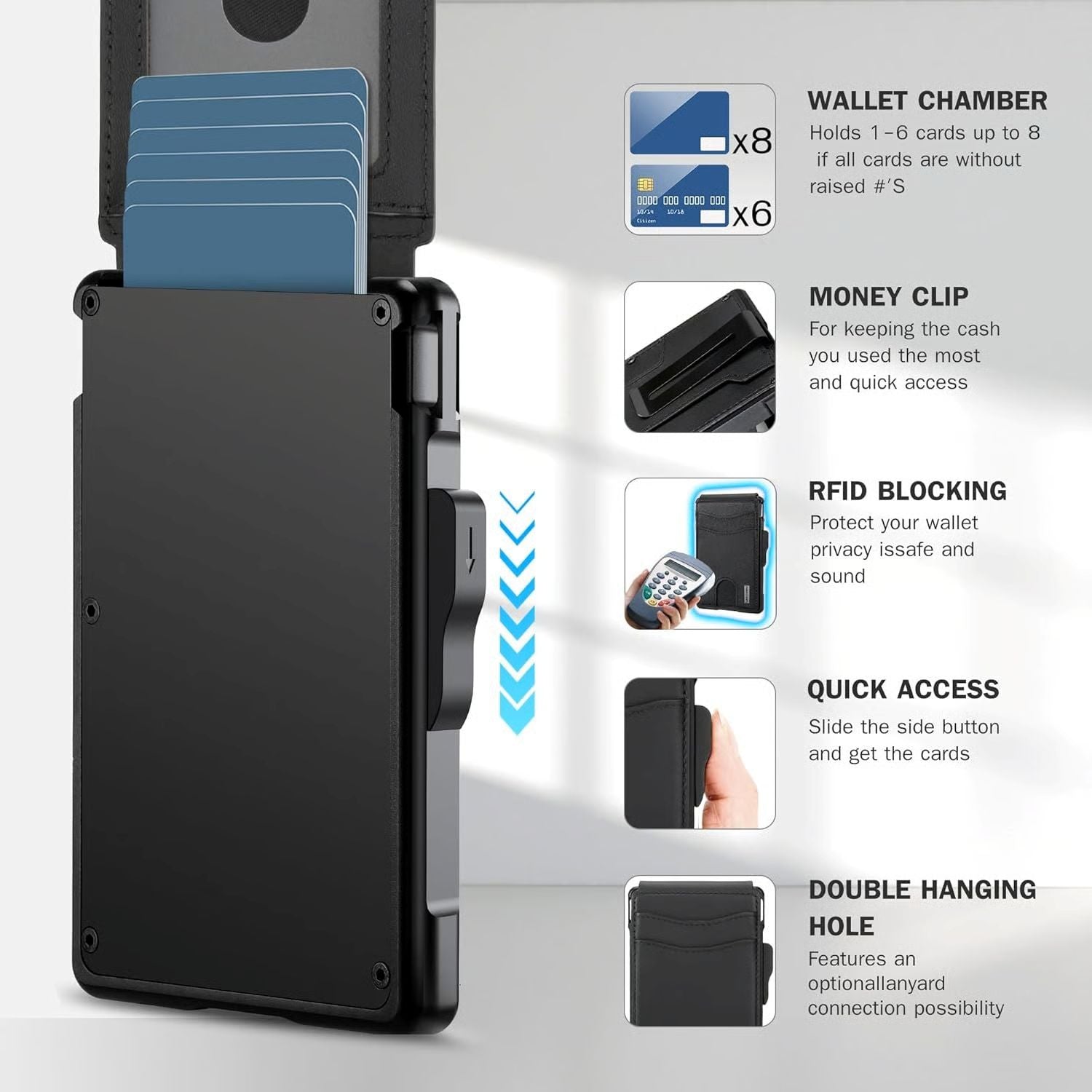 Enough Space: 12 Cards can be inseted in this lightweight and compact wallet, with 3-4 additional cards (1 ID windows included) in the cover, another 6 cards can be stored in the aluminum champer of the wallet, 1 or 2 cards can be inserted in outside of the aluminum champer. A money clip on the inside of the card holder helps you store cash, while an automatic card slot allows you to remove credit cards or ID cards faster.