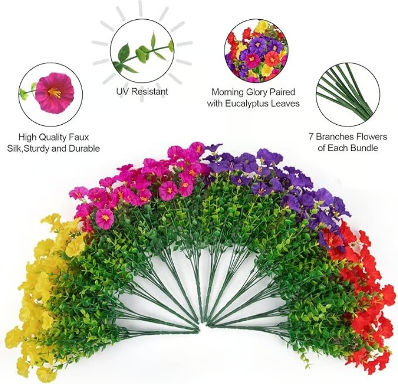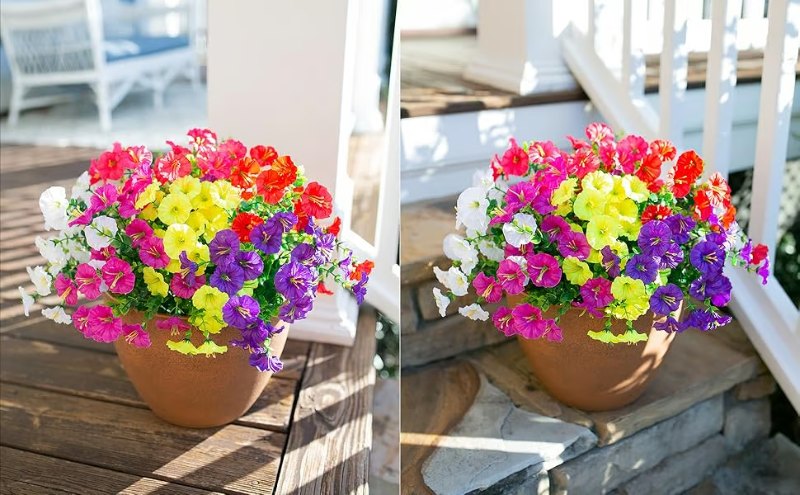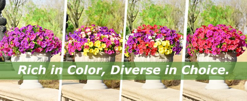 Perfect for gardens, patios, porch, balconies, yard, front door, street, planter, hanging basket, window box, and more. These fake outdoor flowers are a versatile addition to any outdoor space. And you can enjoy the beauty of blooming flowers throughout the year, no matter the weather.