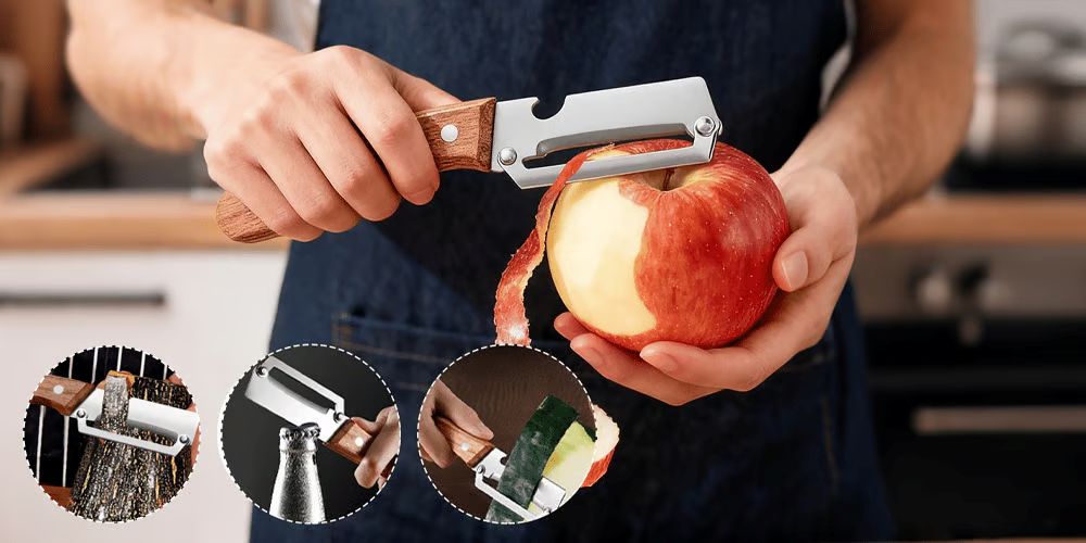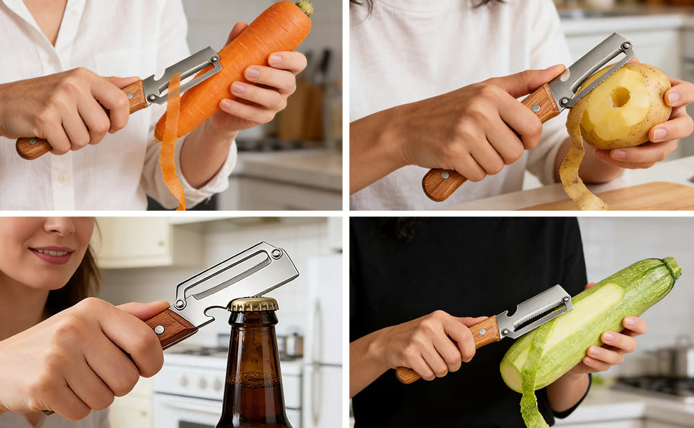 The Integrated Metal Bottle Opener built into the handle base makes this a true multi-tool. Campers, van-lifers, and tailgaters report it's become their go-to: peel dinner, open drinks, store in a compact drawer. One tool, two jobs.
